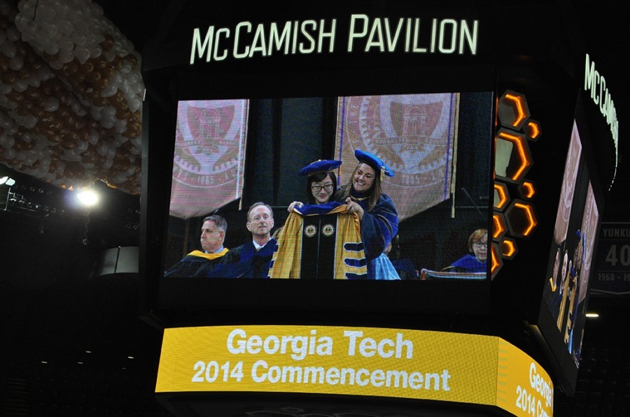 Faculty members presented their graduating Ph.D. students with their doctoral hood, a traditional part of the academic regalia that, at Tech, is lined in white and gold with blue trim to represent philosophy (the “Ph” in Ph.D.).