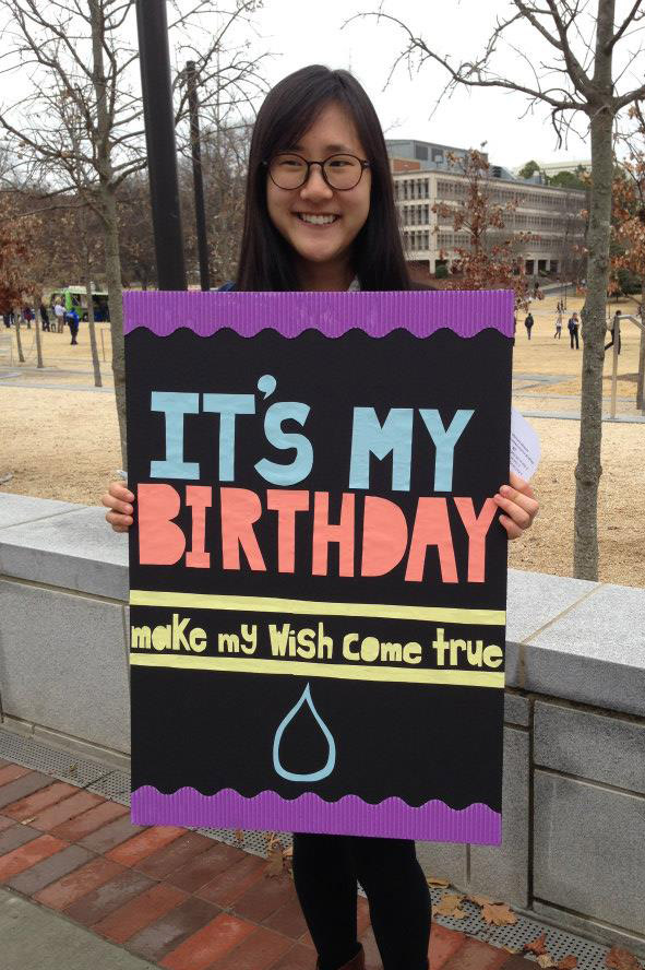 ![]() Civil engineering undergraduate Rebecca Yoo eschewed gifts for her 21st birthday and instead threw a party and asked her friends to donate money to an organization that provides clean water to people who don't have it. She wanted to provide water for 21 people. This photo is from her 20th birthday, when she did something similar, asking for donations along Tech Walkway. (Photo: Rebecca Yoo) |