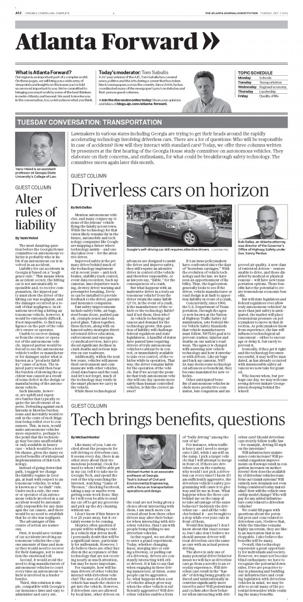 Like many of you, I am excited about the prospects for self-driving or driverless cars. It seems every day, there is another story about their tremendous potential. I look forward to when I will be able get in my car, tell it to take me to Georgia Tech, and spend the rest of the trip searching the Internet, watching “Game of Thrones,” checking Facebook, taking a nap or maybe even getting some work done. Maybe I will even be able to send my car off to get my groceries and pick up the dry cleaning without me.