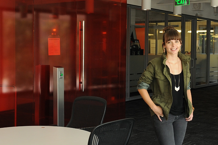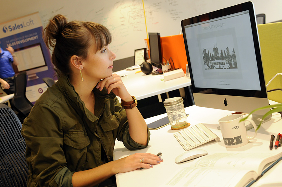 Josie Kressner, Ph.D. 2014, at her desk in the Atlanta Tech Village. Kressner's startup, Transport Foundry, aims to improve the transportation and travel-behavior data regional planners use to make long-term decisions. (Photo by Gary Meek.)