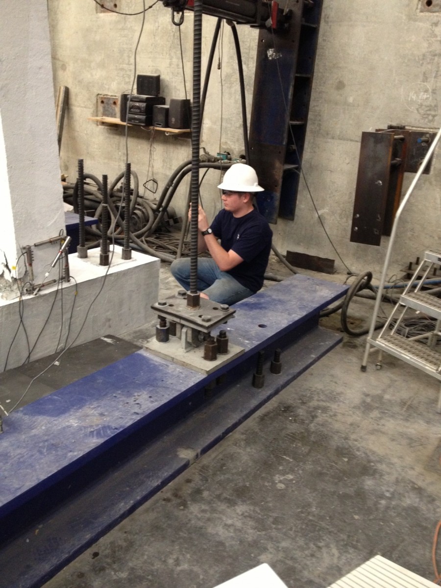 To simulate the energy disbursed in a typical earthquake, each of the columns was subjected to about 25,000 pounds of sustained pressure, applied through a vice-like “actuator” arm that extended from the wall of the CEE Structures Laboratory.
