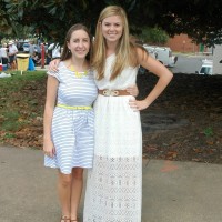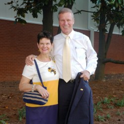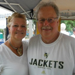 Young and old, almost everyone who showed up to support the Jackets heeded the call to wear white. Fourth year Georgia Tech students Alyssa Nordin and Kaitlyn Johnson were resplendent in their sun dresses, while Larry (GT '73) and Dianne Wylie went for the ever-popular Jackets t-shirts. Dianne made her outfit "pop" by donning a Buzz choker necklace.