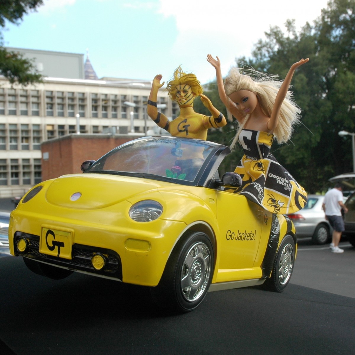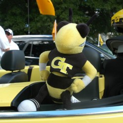 Though he couldn't make it to all of the many tailgating events on Thursday, Georgia Tech President G.P. "Bud" Peterson did don the Institute's colors for a stroll to the stadium. His walk was gleefully interrupted by cheers from enthusiastic fans who were stuck in traffic on 10th Str