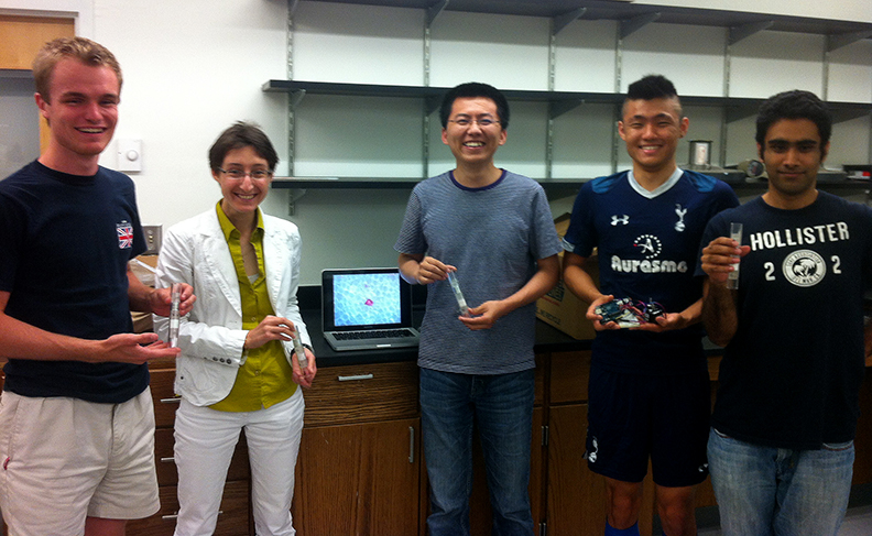 | Arson (second from left) and her research team hold the experiment they've designed to assess how salt grains organize themselves when they're placed under constant pressure. |